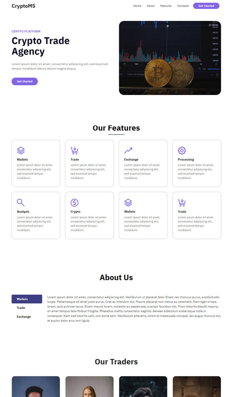 CryptoM5 is a Bootstrap 5 theme created for trading agencies and cryptocurrency exchanges. Its understated appearance allows you to completely present specialized and complex information.