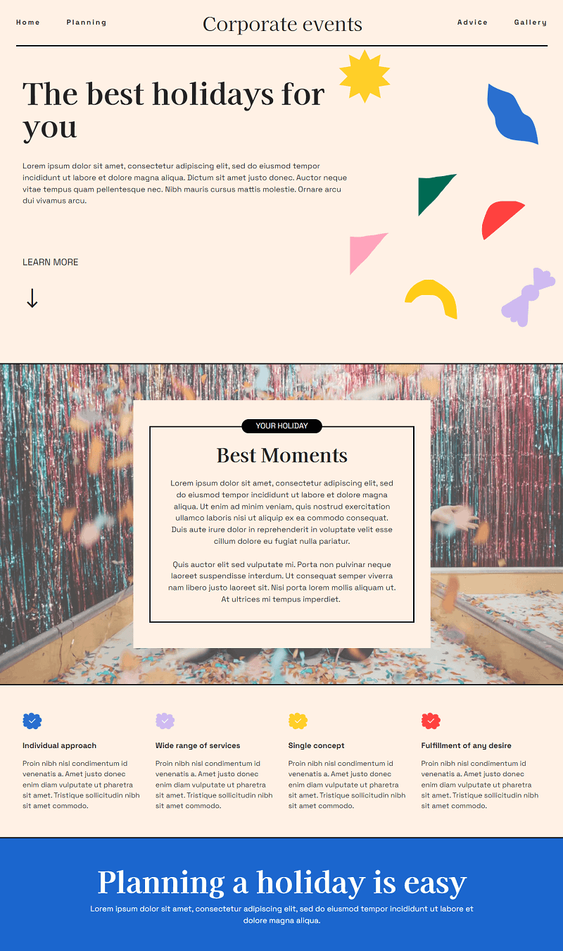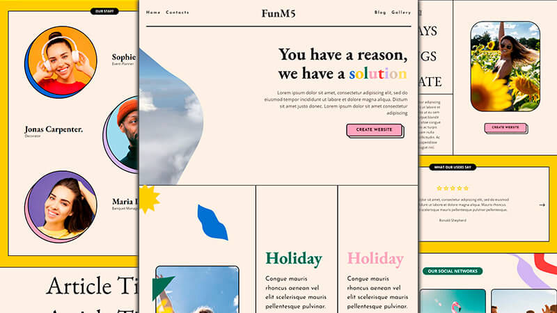 FunM5 is a colorful Bootstrap theme. It is an ideal theme for event planners whether, parties, anniversaries, house warming, weddings, event coordinator, event manager, event facilitator, stage decorator, baby shower planner, event analyst, marriage, celebration, event managers, birthdays, business meetings, happenings, engagement, conference, grand events, contest, tournament. If you want to create a cool website, this theme will provide you with colorful backgrounds, borders, link and button animations, galleries, articles and more.