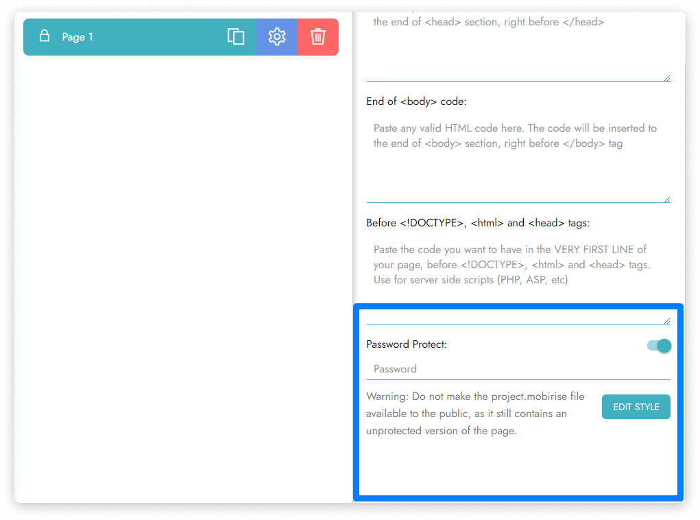1. Go to the page settings, scroll down and turn on the Password Protect switch.